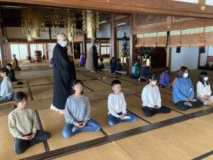 園児・小中学生・保護者が参加し、曹洞宗青年会さまにご協力をいただき、坐禅の組み方や心の持ちよう、食事での作法や感謝の心を教えていただき、坐禅を通して自分をみつめる静かな時間をもちました。