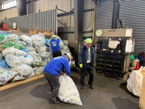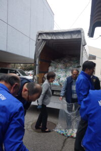 松本市社会福祉協議会にて集積場に収集されたペットボトルキャップを、整理し、積み込んでリサイクル業者まで運搬する作業を行いました。