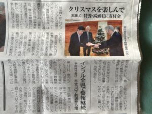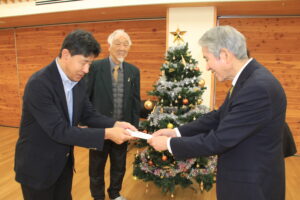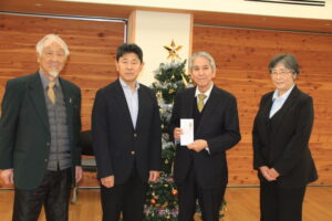 毎年行っている継続事業でもある特別養護老人ホーム高瀬荘へクリスマス訪問をし、甕理事長にケーキ代として2万円を寄付しました。以前はクリスマスのイベントに合わせて養老劇団や会員で結成した楽団などのアトラクションで慰問活動を行ってまいりましたが、コロナ感染などの予防を考慮して寄付に切り替えています。渋田見所長から「利用者の方がとても楽しみにしています。地域の施設と指摘にかけていただき大変ありがたい」と感謝されました。