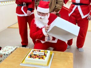 松本深志LC 松本乳児院サンタクロース 2025年12月19日 お知らせ, 活動報告 12月19日 場所:松本乳児院 継続事業として、乳児院へサンタクロースの扮装でクリスマスプレゼントをお届けしました。 おむつで作成したケーキなどの贈り物の他に、本物のケーキもお届けしましたが、ふたを開けた時には子どもたちと職員の皆さんがとても喜んで下さり、嬉しかったです。
