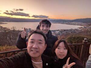 12月16日の朝、ホストファミリーが代わり、長田さんの家へ移動しました。長田さんご夫妻と小さなミオちゃんが、笑顔と愛情で温かく迎えてくれました。朝は諏訪湖で釣りをして、わかさぎの天ぷらを作りました。心に残る貴重な体験です。友人たちと昼食を共にし、非常に美味しい鰻を食べました。午後はボートに乗せてもらい、特に美しい日だったので富士山を眺めることができました。立派なホテルを見学した後、ライオンズクラブの年末・クリスマスパーティーへ参加しました。私はドラムを叩き、伝統舞踊を披露しました。料理は絶品で、皆が温かく迎えてくれました。特に奥村会長をはじめ諏訪湖ライオンズクラブの皆様は、まるで親友のように接してくださいました。